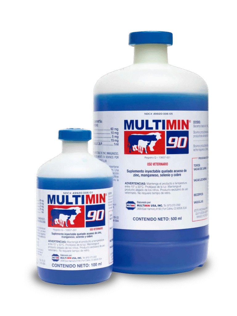 MULTIMIN©90 es una fuente suplementaria quelada e inyectable de zinc, manganeso, selenio y cobre, en una forma fácilmente disponible, que sobrepasa antagonistas en el alimento, forraje, granos de destilería y agua potable que pueden reducir la absorción de estos minerales traza críticos.